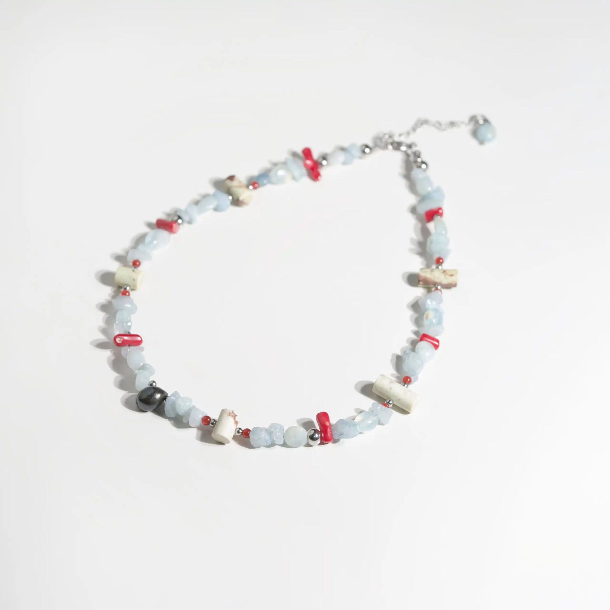 Un diseño lleno de color y energía, compuesto por una selección única de piedras naturales: cornalina, perla cultivada, cuarzo aguamarina, crisopasa limón verde y coral.